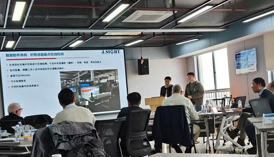 交流会上,佳赛特团队展示了智能验布系统在纺织面料瑕疵检测领域的应用方案,双方围绕AI视觉检测技术如何助力高端织物品质管控展开深入探讨。